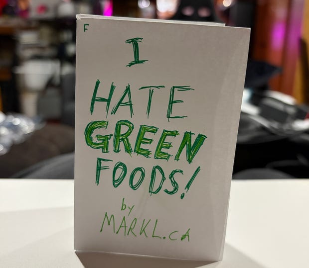 Today we went out for Starbucks and took a trip to the locally owned art supply store. Since the weather wasn’t great for being outside, she suggested we go home and make zines together. She had been really into zines lately, so that’s what we did. While we were at the art store I picked up two purple pens and two green. I made her choose between green or purple. She chose purple. I then challenged her to make a zine about that colour, with only two shades of purple in 20 minutes. I did the same with the green pens. Her zine turned out pretty good. Mine? Well…🤣