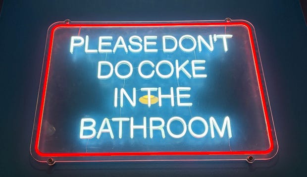 March 14: For the first time in forever, I went out for drinks last night. I had to laugh when I saw this sign outside the men’s room. Okay, maybe I was a little drunk and found it funnier than it really was. How much coke do your customers need to do in the bathroom before it becomes such a problem that you need to purchase a neon sign?